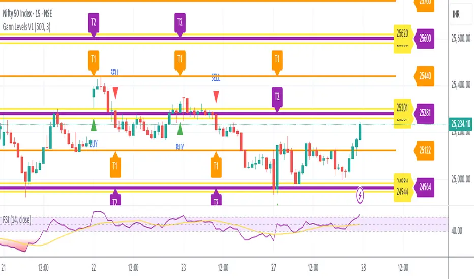 The indicator automatically calculates dynamic Gann price levels and converts them into actionable Buy & Sell signals, making it extremely easy to analyze and execute trades—even for beginners.