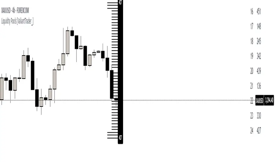 This "Liquidity Pools" indicator by ValiantTrader is designed to help traders visualize potential areas of liquidity in the market. Here's how it works and how traders use it: