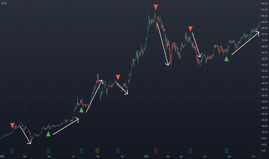 As one can see on the chart, there are a lot of situations where EPS readings with green labels (the ones that beat analysts' estimates) lead to down moves. The DEPSS indicator can spot weak earnings and give opposite signals.