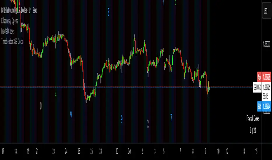 The Timebender Digits indicator visualizes rhythmic price cycles by marking confirmed swing highs and lows with dynamically colored numerical stamps.