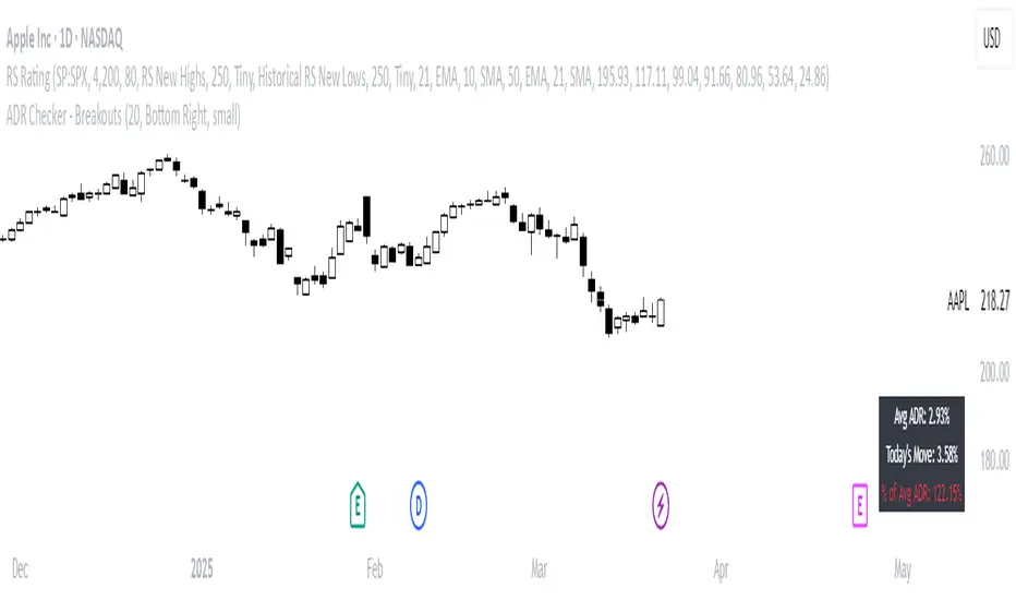 The ADR Checker - Breakouts is a powerful yet simple visual tool that helps traders instantly assess whether a stock has already exceeded its Average Daily Range (ADR) for the day — a critical piece of information for momentum traders, swing traders, and especially those following breakout, VCP, or CANSLIM strategies.