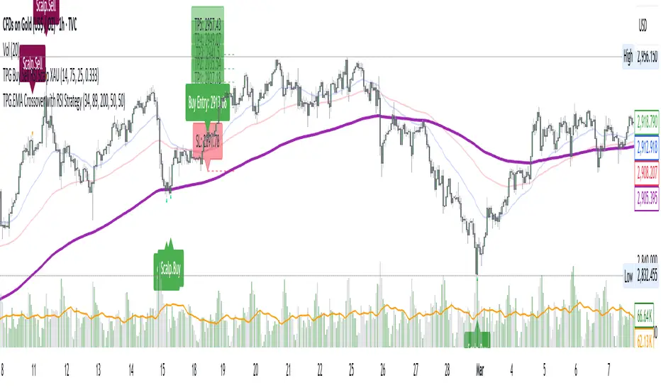 This script is designed to provide RSI-based buy and sell signals for scalping, specifically targeting XAU (Gold). It integrates RSI overbought/oversold conditions with various candlestick patterns like engulfing patterns, hammer/shooting star, and two consecutive bullish/bearish bars to identify potential entry points.Here's a quick breakdown of the features and logic:
