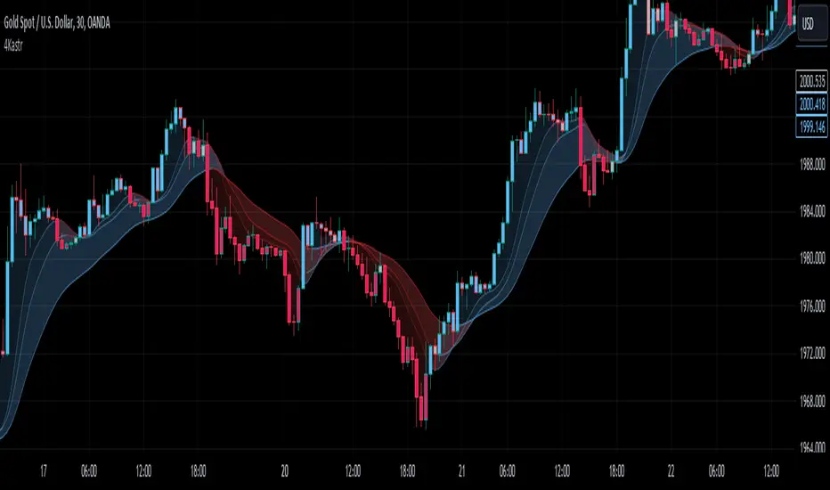 This indicator features fast, medium, and slow exponential moving averages (EMA). Trading occurs based on their crossovers; when they intersect below, a red cloud begins to form, prompting a sell position.