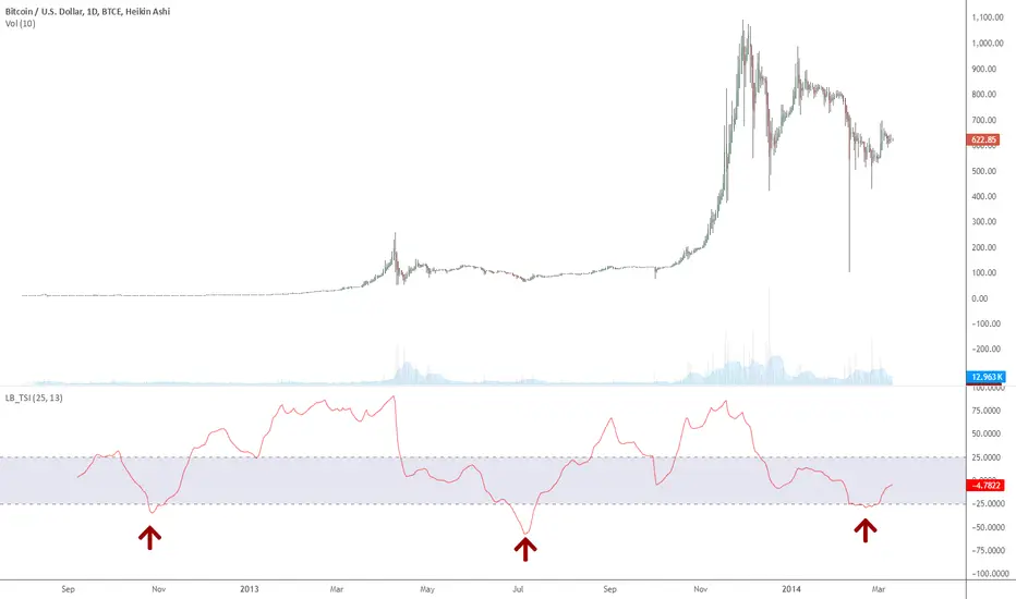 TSI is a "double smoothed" indicator. It is used just like RSI. Overbought and oversold levels differ. They are marked by the indicator.