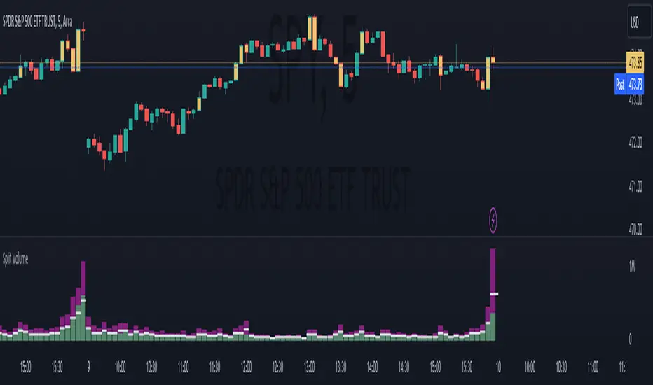 The Split Volume indicator displays 'Upwards' and 'Downwards' volume with an additional method for distributing 'split' candle volume.