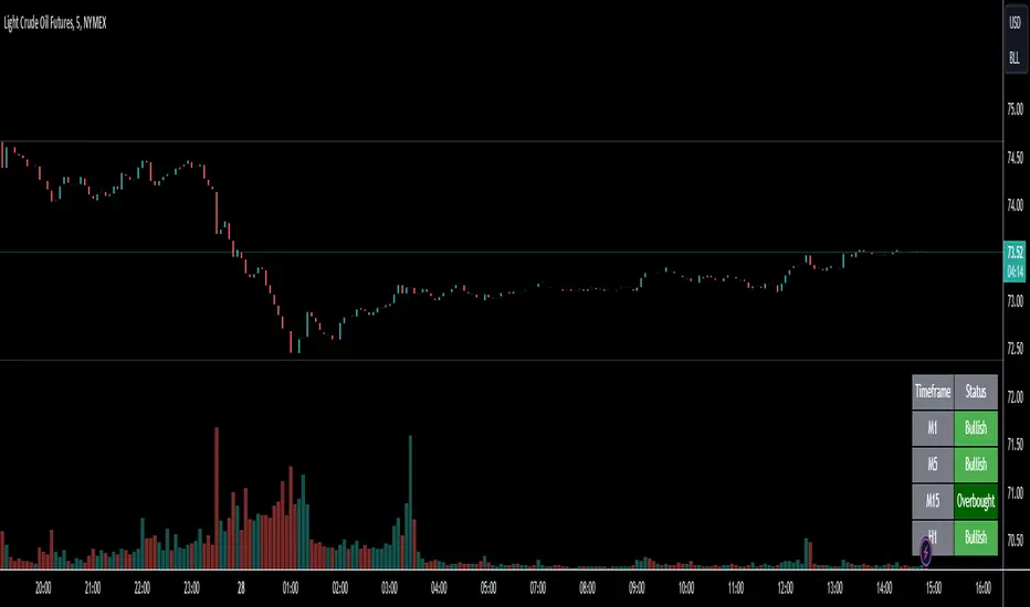 The color-coded table (green for Bullish/Overbought, red for Bearish/Oversold, orange for Indecision) allows traders to quickly identify dominant conditions and momentum alignment across timeframes, helping in trade confirmation.