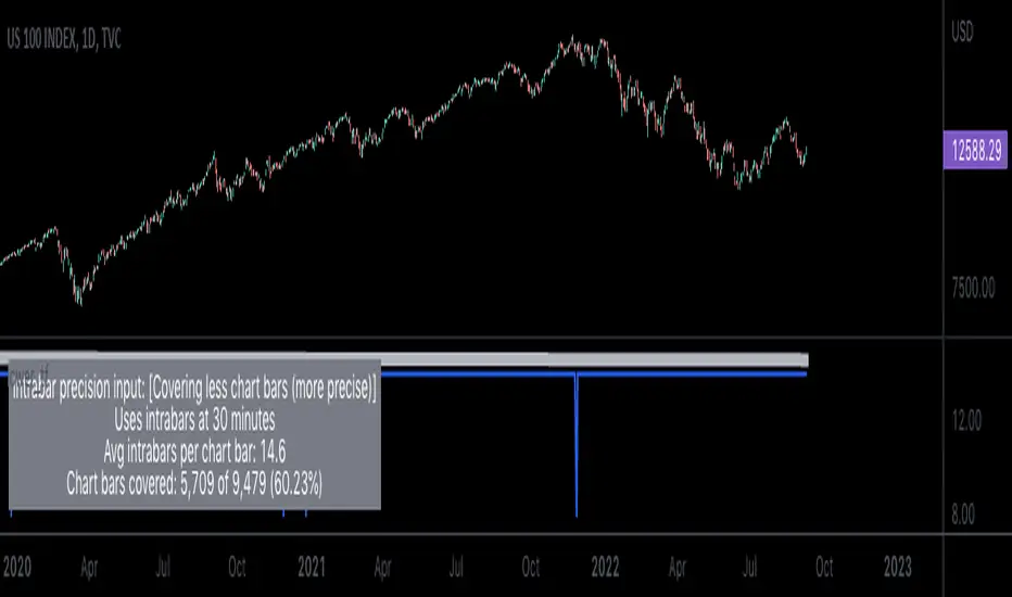 The precision of calculations increases with the number of intrabars analyzed for each chart bar. As there is a 100K limit to the number of intrabars that can be analyzed by a script, a trade-off occurs between the number of intrabars analyzed per chart bar and the chart bars for which calculations are possible.