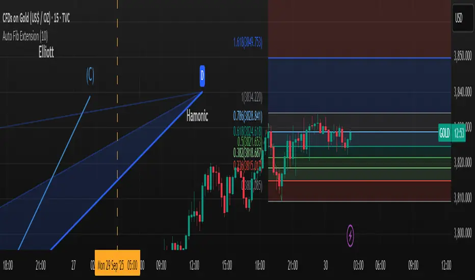 A lightweight Fibonacci extension overlay that anchors to the most recent confirmed swing (two pivots) and plots one clean set of levels. Built for Pine v5 with no external libraries, it’s stable, fast, and easy to customize.