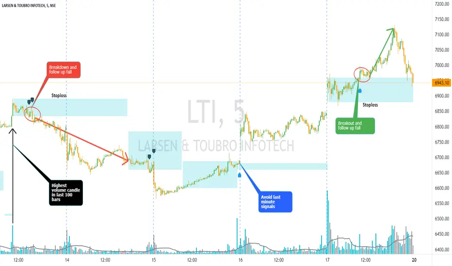 Volume shows strength of a movement and highest volume shows the region that pushed price to certain extent with full strength. Breakout or Breakout of the highest volume bar range shows continuity further push by sellers or buyers indicating a trend continuation for a small period if not for long duration. Entries can be taken once signal is generated with stoploss as recommended.