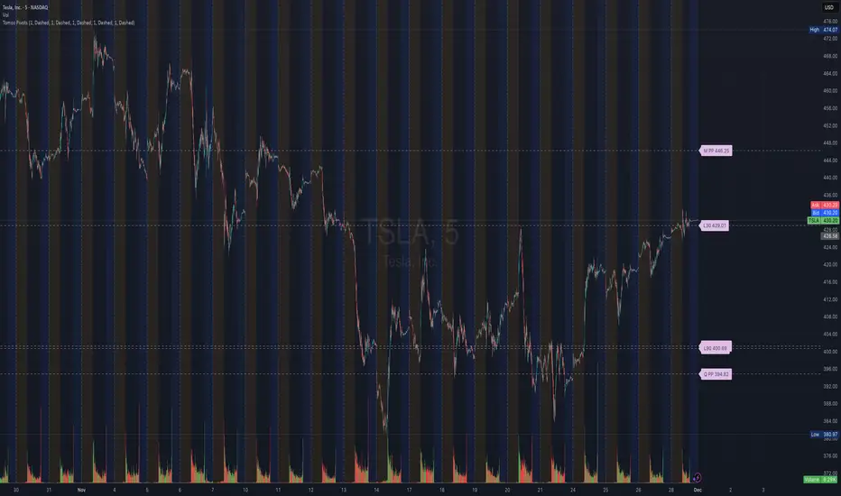 These are pivots that you can use to look back at various time periods to find magnetic Price points of support and resistance. There are: weekly, last 30 days, last month, last 90 days, and last quarter. You can change the color and style of every indicator and its label. So if it happens to be November 29 today, you will see the last 90 days representing 90 days before November 29. But you will also see last quarter which represents from July 1 to September 30. These values are fair value equilibrium price point by averaging the high low and close of that time period. Weekly is great for intraday trading and the last 30 is great for momentum. Consider using the monthly for swing trading. Stay in the green.Open-source script