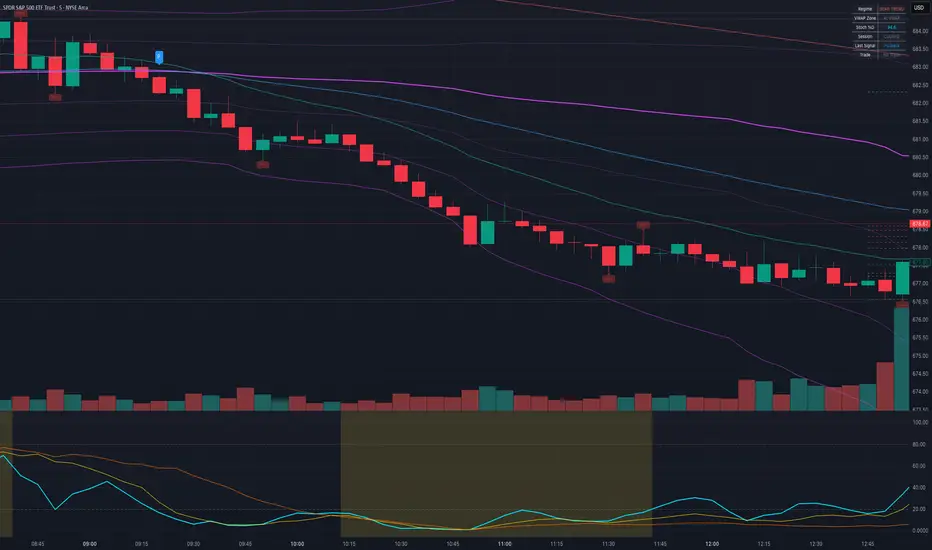 When regime, VWAP zone, stochastic position, and setup all align—a signal appears on your chart.