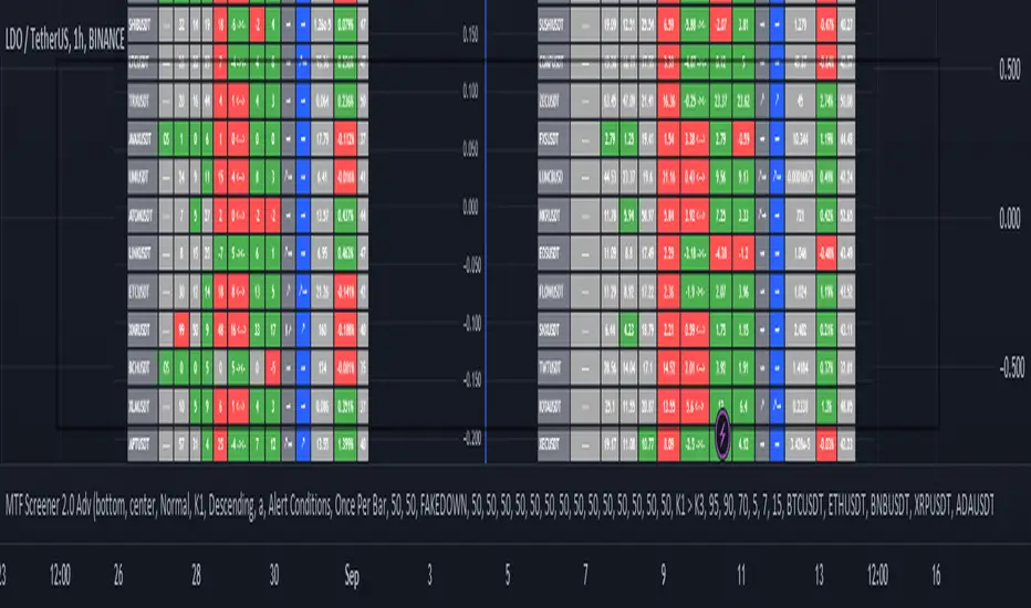This table screener basically writes all the MTF data in a table showing mainly the chart's status as an option of (Oversold, Overbought, Fakeup or Fakedown) as well as the K1, K2, K3, Gap, value change from last candle data of all requested charts. Therefore acting as a market scanner for people who want to save the time needed to scan the whole market manually.