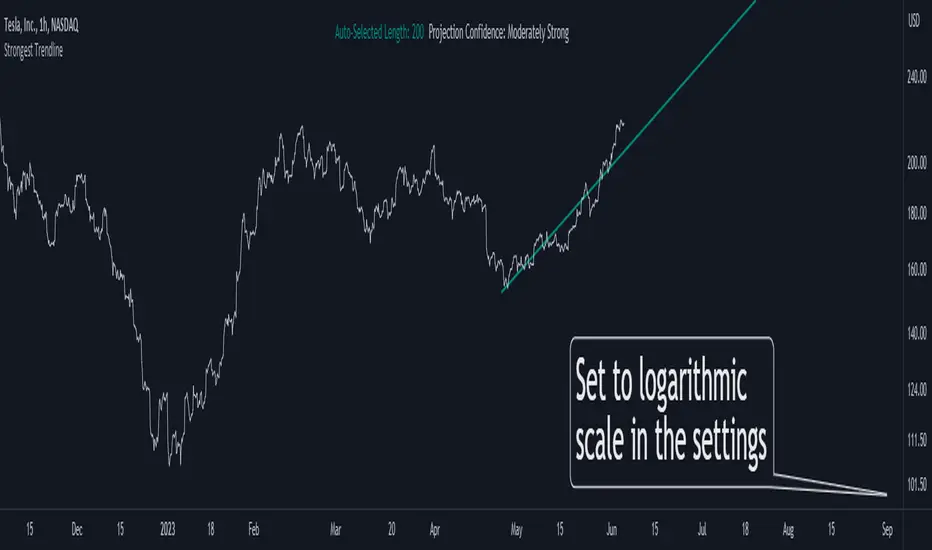 When using the "Strongest Trendline" indicator, it is recommended to utilize a logarithmic scale. This scale accurately represents percentage changes in price, allowing for a more comprehensive visualization of trends. Logarithmic scales highlight the proportional relationship between prices, ensuring that both large and small price movements are given due consideration.