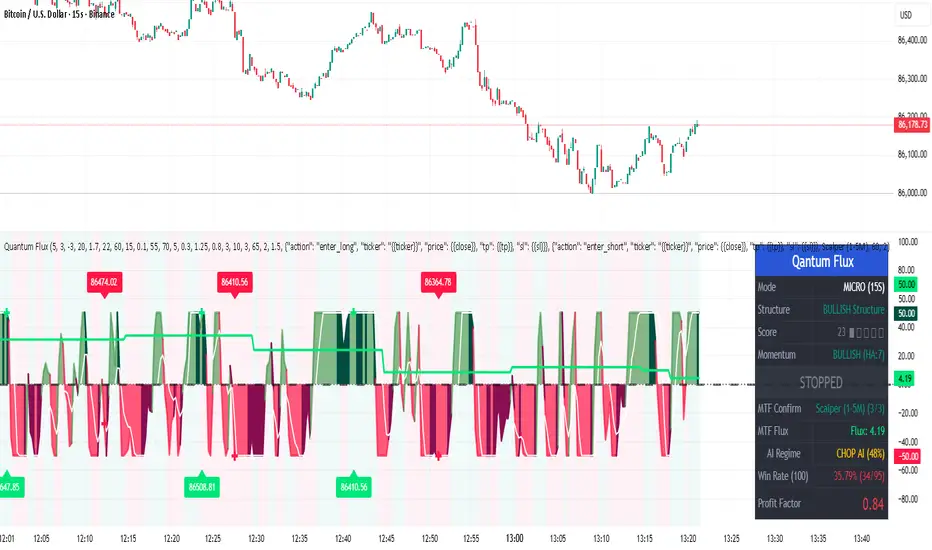 This oscillator stands independent of any public or open-source codebases, including the author's prior AMF PG Strategy 2.3 (a publicly available trend-following framework). Quantum Flux introduces an entirely original hybrid core: a Heikin-Ashi-derived flux momentum oscillator, neural-weighted regime memory (attention-like scoring across 8 market factors), institutional confluence validator (blending structural shifts with liquidity dynamics), and a 0–100 layered scoring matrix with adaptive boosting. The regime-shifting logic—dynamically recalibrating filters via volatility-normalized thresholds and multi-engine veto power—represents the author's protected innovation. Source code preservation is vital to safeguard this intellectual edge.