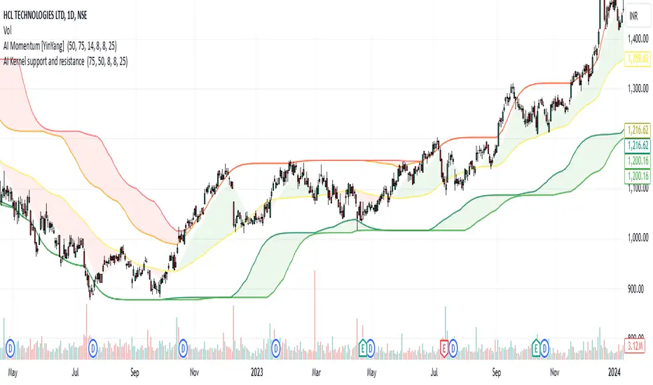 Rational Quadratic-based AI IndicatorThe Rational Quadratic-based AI Indicator is a sophisticated tool designed to assess market trends and signals by leveraging the Rational Quadratic Kernel. This indicator integrates the principles of machine learning and kernel methods, utilizing a non-linear approach to model complex data relationships in financial markets. By applying the Rational Quadratic kernel function, the indicator can effectively capture long-range dependencies and non-stationary data patterns that simpler models might miss.
