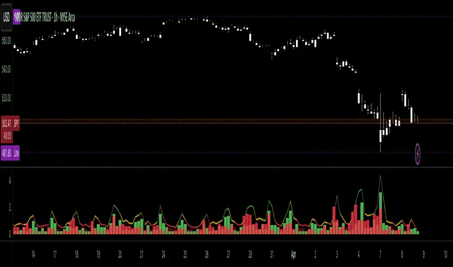 ⚖️ At its core, the tool builds a histogram of relative volume (RVOL). When enabled, a second layer overlays directional effort by estimating buy vs sell volume using candle body logic. If the candle closes higher, green (buy) volume dominates. If it closes lower, red (sell) volume leads. These components are stacked proportionally and inset beneath a colored cap line—a small but powerful layer that maintains visibility of the true effort tier even when split bars are active. The cap matches the original zone color, preserving context at all times.