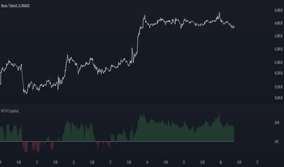 - Multi-Timeframe Integration: The script pulls VFI calculations from multiple timeframes, providing a holistic view of market trends. By analyzing VFI across different timeframes, traders can detect alignments or divergences in volume flow that might indicate trend strength or weakness.