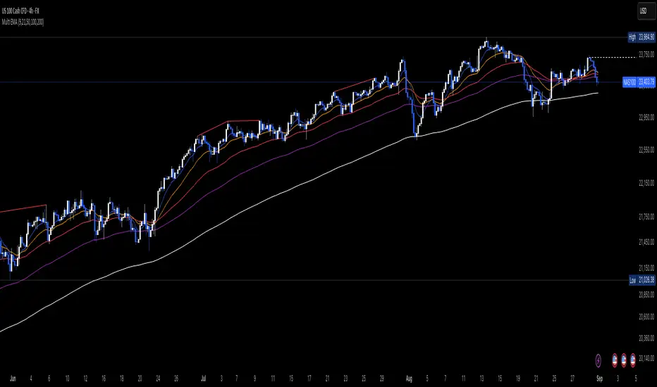 * **Five Key EMAs:** Displays EMA 9, 21, 50, 100, and 200.