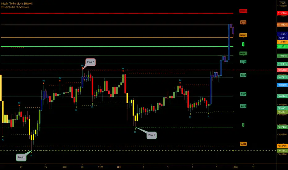 ™TradeChartist Fib Extensions is a free to use script that helps traders plot Fibonacci Extensions on chart. Even though Trading View has a Fib extensions tool, some traders may prefer a plotting script like this with Fib plot lines extending across the whole of the chart to track historic prices in relation to Fib extensions drawn.