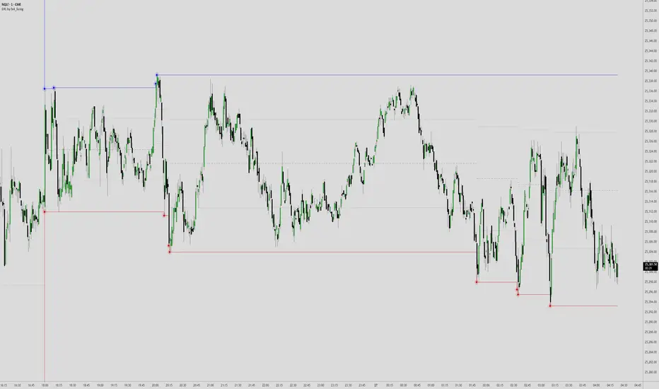It computes and displays the highest and lowest prices observed within the specified session (used as external range liquidity), updating dynamically with each bar, and includes optional midpoint and quartile levels represented by horizontal lines that adjust as the range develops.