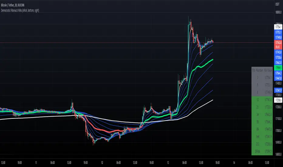 The FibMA lengths of 3 and 233 are plotted in white by default, the FibMAs with lengths between 3 and 233 are plotted in blue by default, and the democratic line (DFMA) that averages these lines is plotted in green or red (depending on if the value is above or below the 233-length FibMA).