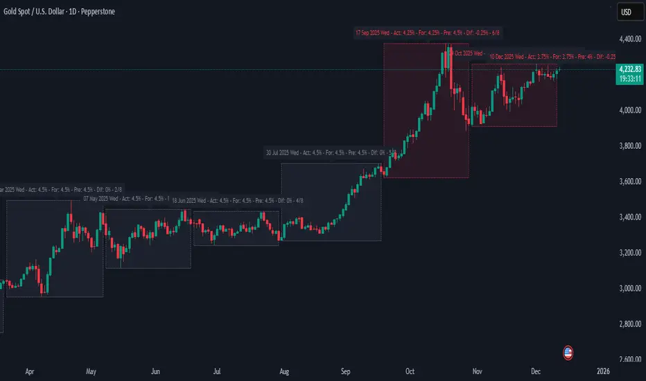 • Visual FOMC Periods - Automatically highlights each FOMC meeting period with colored boxes spanning from announcement to the next meeting