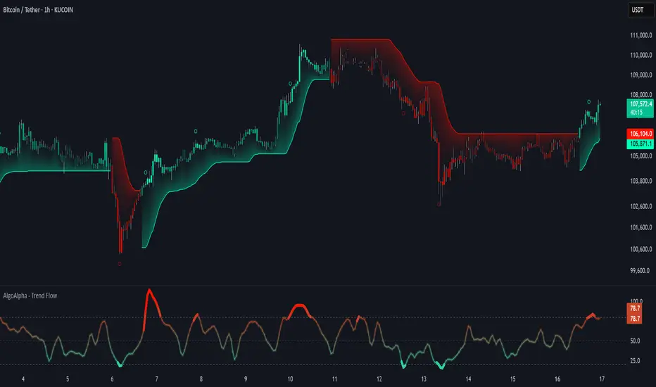 The AlphaTrail calculates a volatility-adjusted channel around price using the Hull Moving Average as the base and an EMA of range as the spread. It adaptively shifts based on price interaction to capture trend reversals while avoiding whipsaws. The direction (bullish or bearish) determines both the band being tracked and how the trail locks in. The Money Flow Index (MFI) is derived from hlc3 and volume, measuring buying vs selling pressure, and is further smoothed with a short Hull MA to reduce noise while preserving structure. These two systems work in tandem: AlphaTrail governs directional context, while MFI refines the timing.