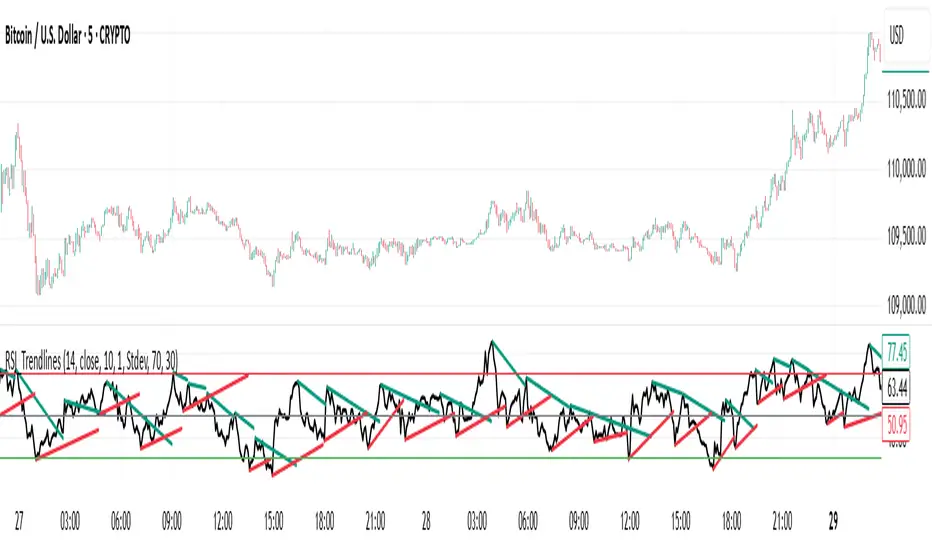 - This indicator enhances RSI by plotting dynamic trendlines on RSI pivot highs and lows.