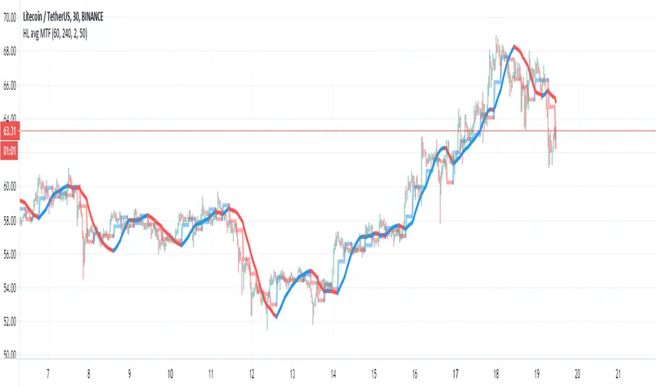if close are above the blue line then we are above the avg of the high and low of the mtf candle .. this indicate a positive trend. if we close is bellow the blue line then it a negative trend and it good time to short it .
