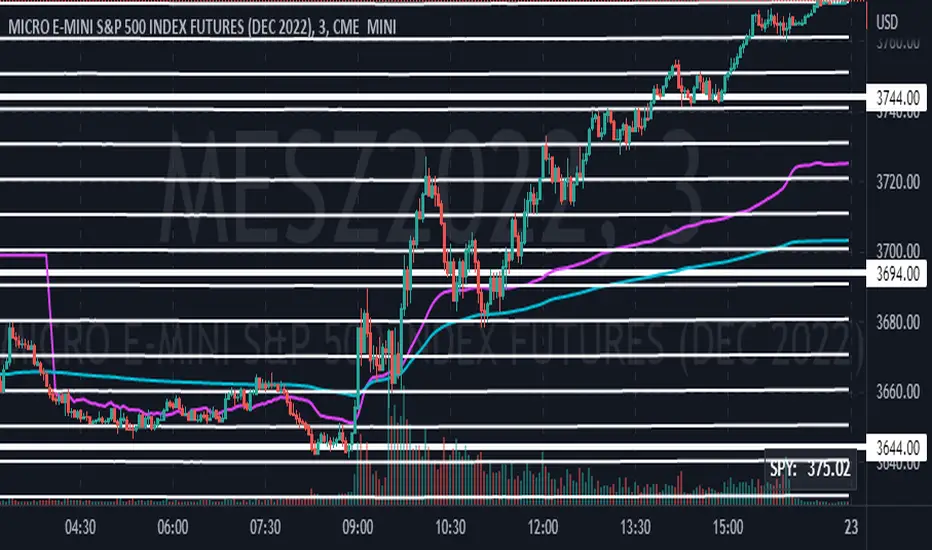 Modified the script to only require the opening price of SPY or QQQ, rounded to the nearest whole number, to be input (default value is 370). The script will now calculate the 10 closest strikes/levels above and below the specified price and automatically plot them on ES or NQ based on the ETF chosen. Also, reduced the default line sizes. Release Notes