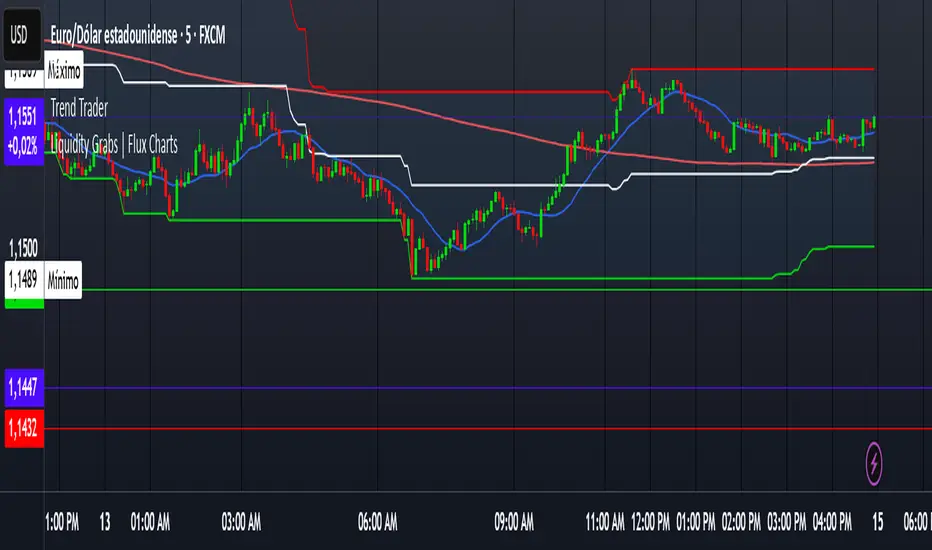 The "Trend Trader" indicator, created by Gerardo Mercado as a legacy project, is a versatile trading tool designed to identify potential buy and sell signals across various instruments. While it provides predefined settings for popular instruments like US30, NDX100, GER40, and GOLD, it can be seamlessly adapted to any market, including forex pairs like EUR/USD. The indicator combines moving averages, time-based filters, and MACD confirmation to enhance decision-making for traders.