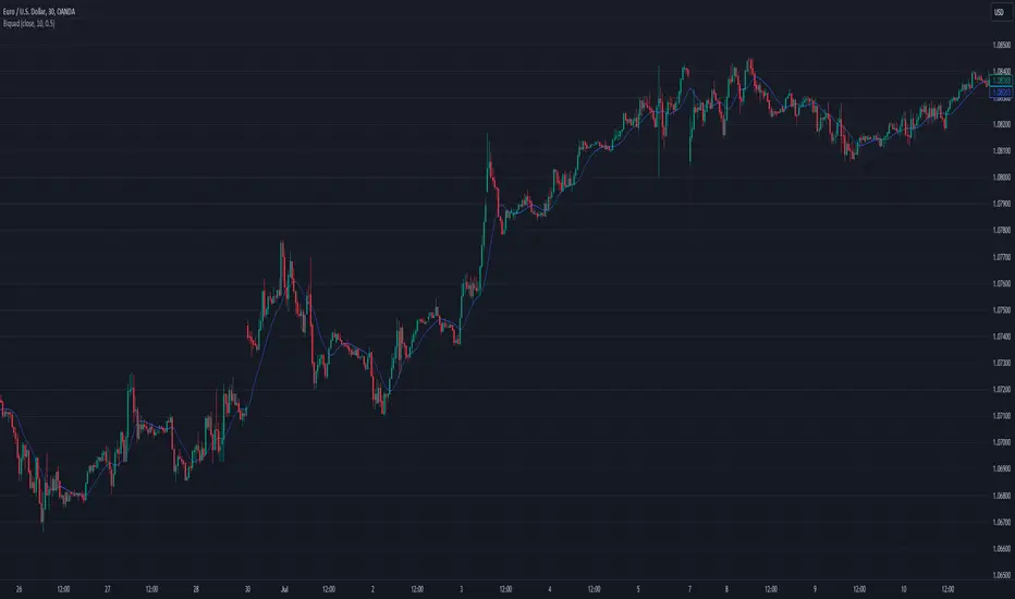 Biquad filters are a type of digital filter that provides a combination of low-pass, high-pass, band-pass, and notch filtering capabilities. In this implementation, the biquad filter is configured as a low pass filter, which allows low-frequency signals to pass while attenuating higher-frequency noise. This is particularly useful in trading to smooth out price data, making it easier to spot underlying trends and patterns.