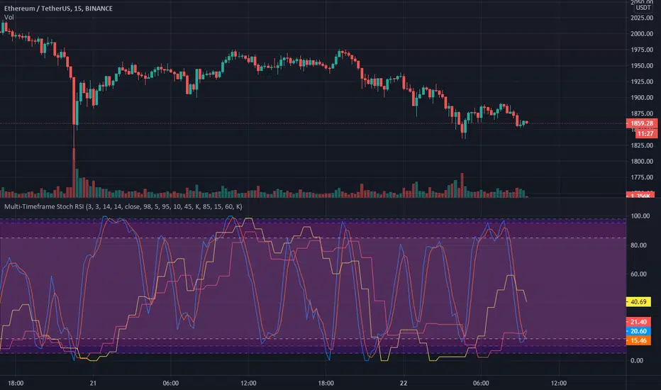 Nothing too complex: by enabling the relative checkbox and setting the desired (k, d or the RSI ) source and timeframes, you can see higher timeframes data plotted on your screen.