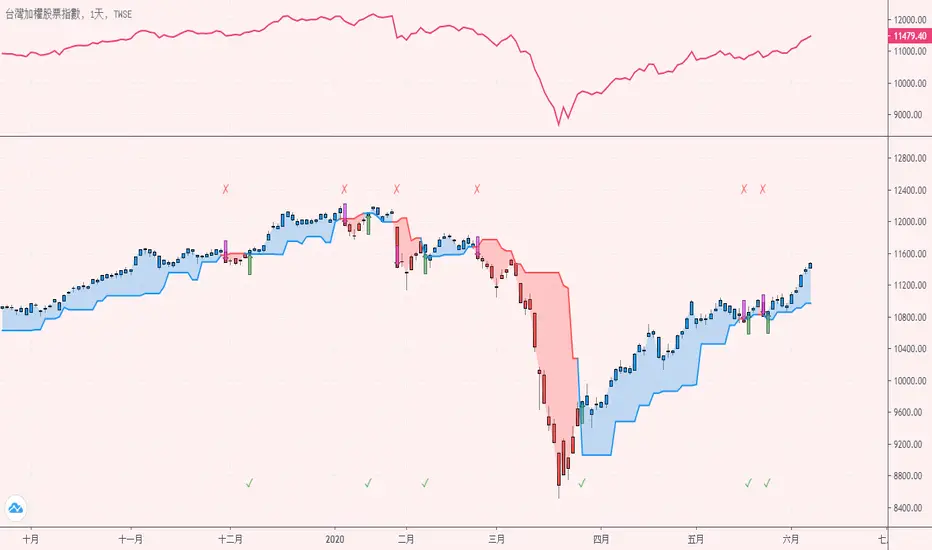 整合了十一種能夠自適應性的移動平均模型。起初只是想要做一個基本款ATR指標,後來將價格加減N個ATR倍數,形成兩條序列形成通道,再使用支撐阻力突破的概念去設計它,再形成兩條自適應性的序列形成通道,再取中間值當成信號。當價格與信號交叉,則判斷作多或者作空。