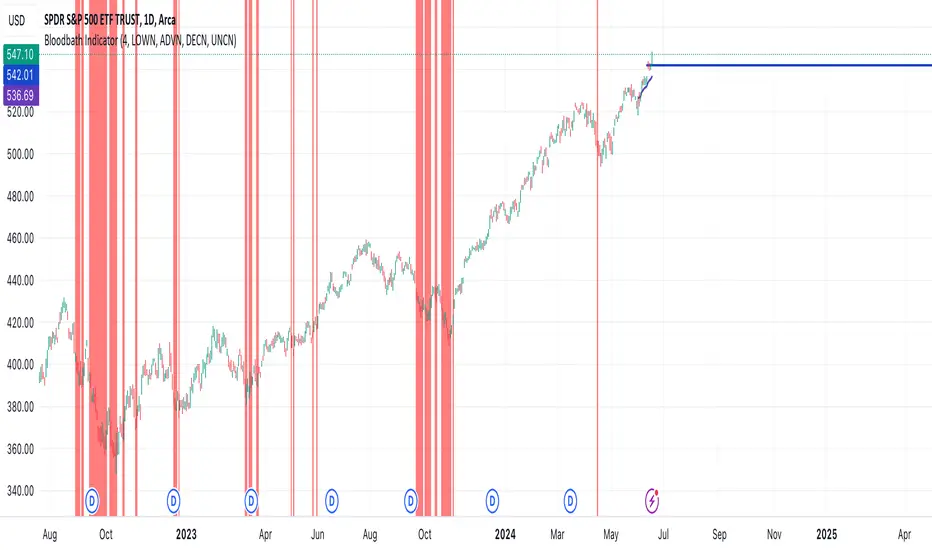 This indicator identifies days where the number of new 52-week lows for all issues exceeds a user-defined threshold (default 4%), potentially signaling a market downturn. The background of the chart turns red on such days, providing a visual alert to traders following the "Bloodbath Sidestepping" strategy.