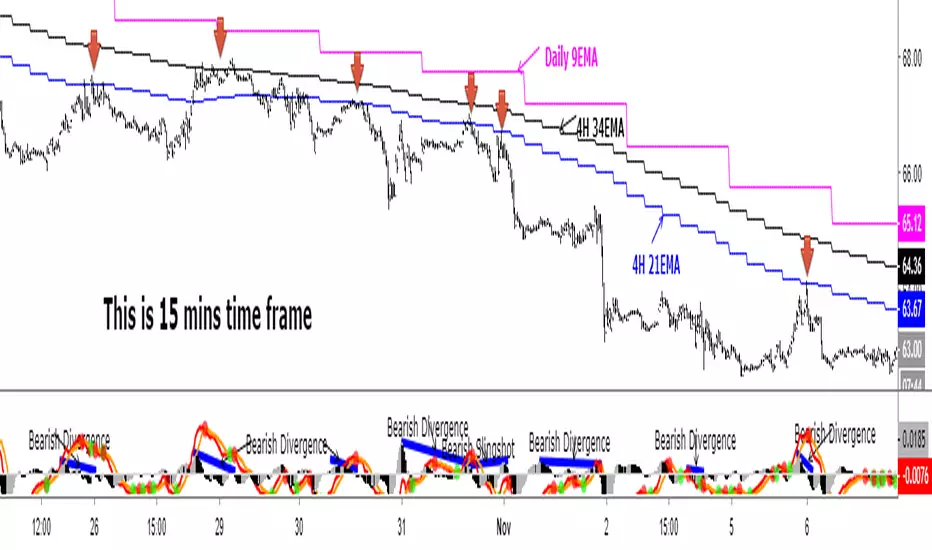 First of all, if price is below the pink line (Daily 9EMA), it means the big trend is downtrend (and vice versa). When price retrace and reach the blue (4H 21EMA) or black (4H 34EMA) or the pink (Daily 9EMA) line (look at the red arrows), if there is bearish divergence / slingshot at the MACD's histogram together with a reversal candle such as pin bar (shooting star), dark cloud cover or bearish engulf, it's a short setup. We don't need to put the Stop Loss immediately. We can wait for the price to resume in the direction of the big trend to trail the SL.