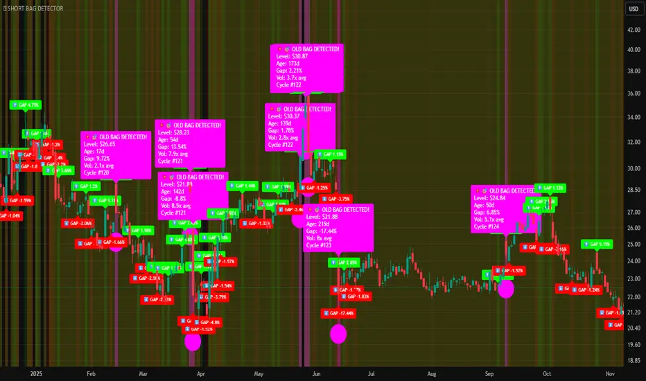 The SHORT BAG DETECTOR is a powerful volatility and volume-based indicator designed to identify high-probability price areas where trapped short sellers (those holding a "short bag" of losing positions) are most vulnerable to a short squeeze or liquidation event.