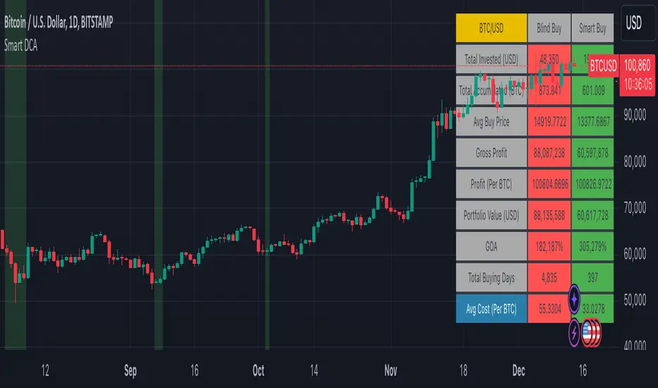 The Smart DCA Strategy leverages a creative approach to using Moving Averages to identify the most opportune moments to buy. A trigger occurs when a daily candle, in its entirety including the high wick, closes below the threshold line or box plotted on the chart. The indicator is designed to facilitate both backtesting and live trading.