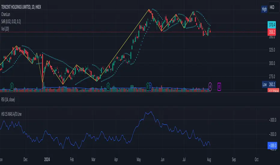 This script calculates the Advance-Decline Line (AD Line) for the top 15 most active stocks within the Hang Seng Index, representing a significant 65.82% of the index's total weight. The AD Line is a crucial breadth indicator, measuring the difference between the number of advancing and declining stocks within the selected 15 constituents. By tracking this cumulative difference over time, the AD Line provides insights into market trends and potential reversals, reflecting the underlying strength or weakness of the market.