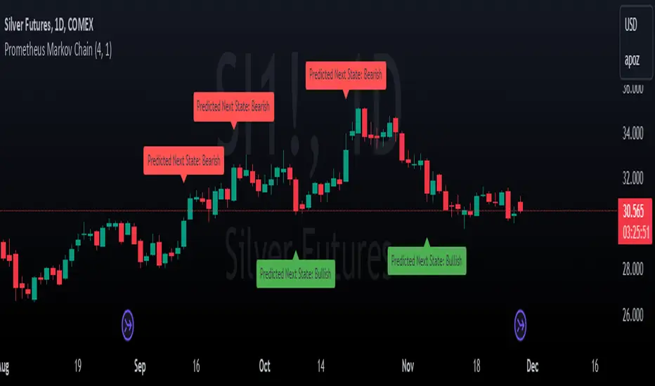 The Prometheus Markov Chain Indicator is a custom-built tool designed to predict potential future price movements using a Markov Chain approach. A Markov Chain is a statistical model that assumes the probability of moving to a future state depends solely on the current state. In this indicator, states represent price movement classifications—bullish, bearish, or neutral—and are determined based on historical price changes (percentage returns). The indicator builds a transition matrix to calculate probabilities of transitioning from one state to another, enabling traders to identify patterns and forecast likely price actions.