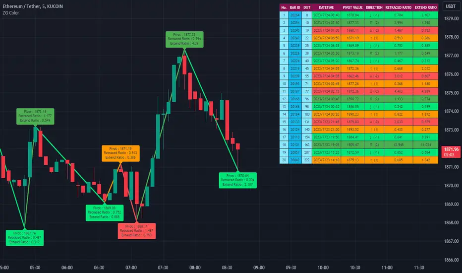 One of the standout features of this indicator is the color coding applied to the Zigzag line, which intuitively reflects the trend associated with each pivot point. The color scheme is as follows: