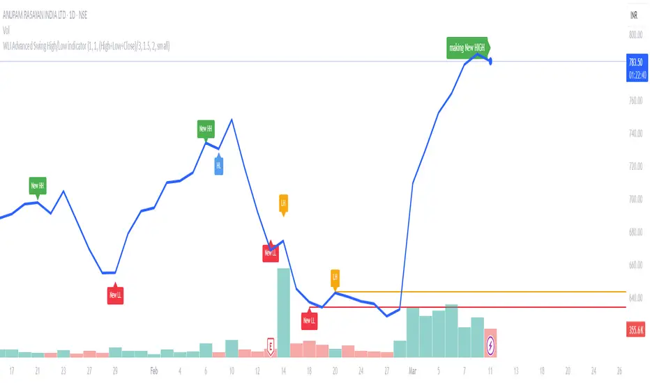 - Displays “making New HIGH” if the current bar’s chosen price source crosses above the last swing high.