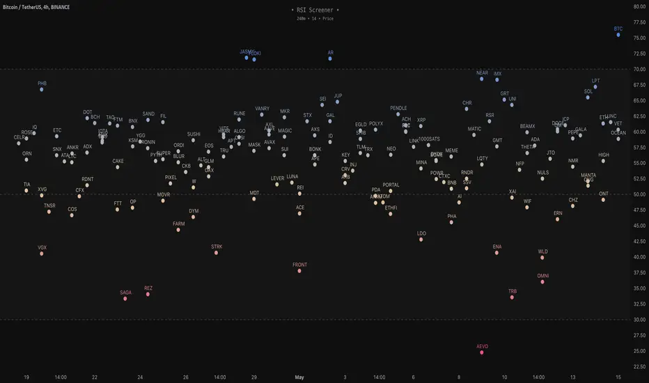 This script allows you to quickly scan the market by displaying the RSI values of up to 280 tickers at once and visualizing them in an easy-to-understand format using labels with heatmap coloring.