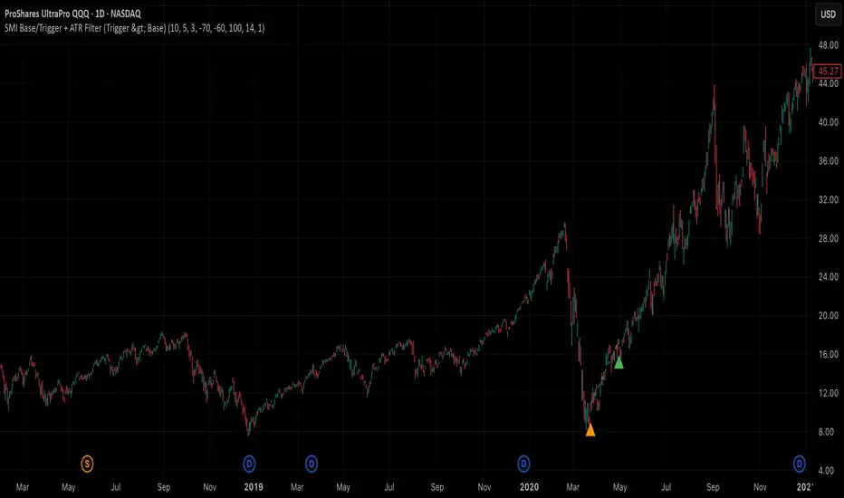This indicator highlights a two-step bullish pattern using Stochastic Momentum Index (SMI) plus an ATR distance filter: