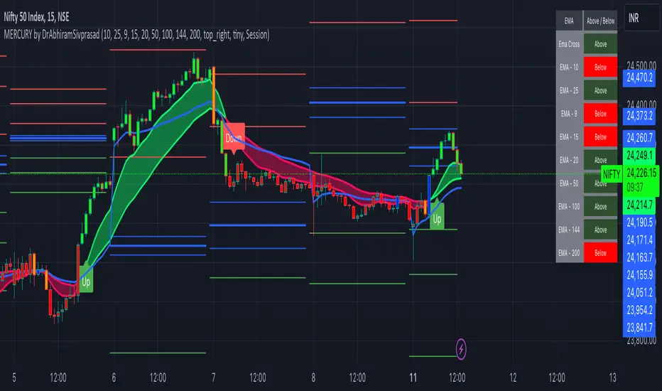 The MERCURY indicator is a comprehensive trading tool designed to enhance traders' ability to identify trends, breakouts, and reversals effectively. Created by Dr. Abhiram Sivprasad, this indicator integrates several technical elements, including Central Pivot Range (CPR), EMA crossovers, VWAP levels, and a table-based EMA dashboard, to offer a holistic trading view.