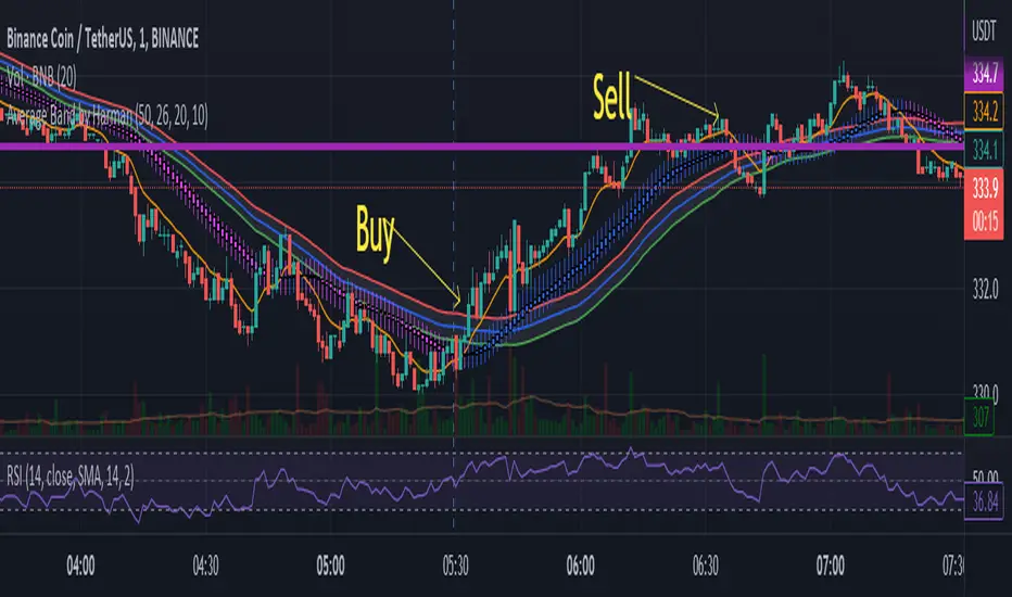 Method 1 : When candles are being formed above the candle line (line near to candles) and it crosses the band or wave from below to upside, then long trade can be initiated. Similarly, When candles are being formed below the Candle line and it crosses the band or wave from upside then short trade can be initiated. Stop loss can be maintained below the band for Long trade and above the band for short trade. Candle line can be used to trail the stop loss.