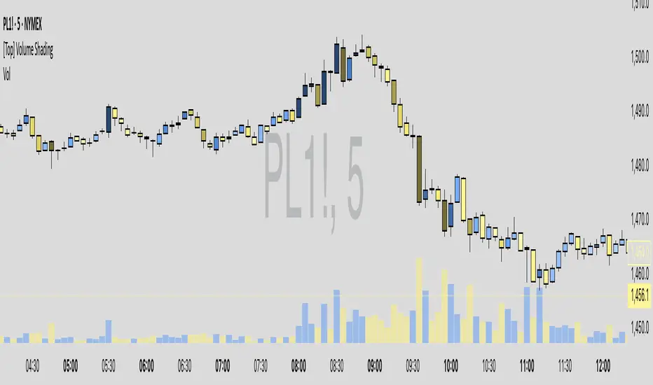 The [Top] Volume Shading indicator dynamically adjusts the color brightness of each price bar based on relative volume levels. It helps traders quickly identify whether a candle formed on low, average, or high volume without needing to reference a separate volume pane.