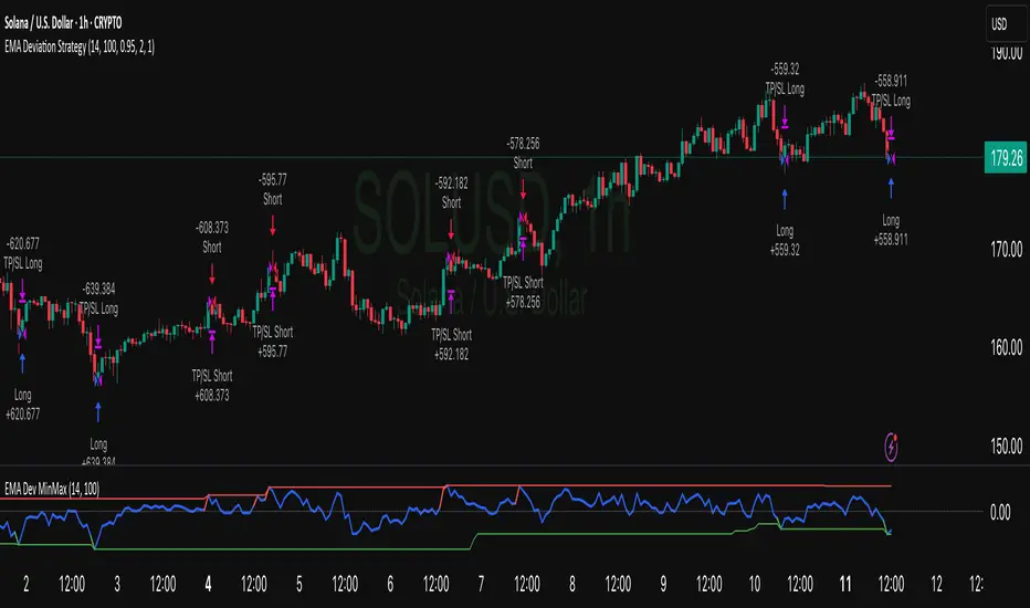 The EMA Deviation Strategy identifies potential reversal points by measuring how far the current price deviates from its Exponential Moving Average (EMA). It dynamically tracks the minimum and maximum deviation levels over a user-defined lookback period, and enters trades when price reaches extreme zones.
