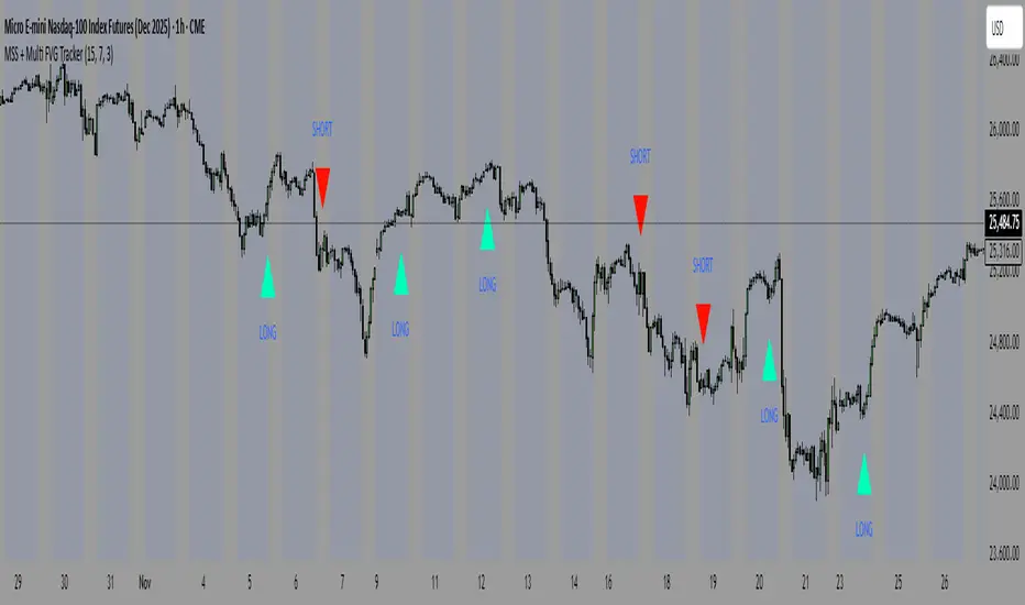 An advanced institutional trading tool that combines Market Structure Shift (MSS) detection with multi-level Fair Value Gap (FVG) tracking. This indicator identifies breakouts of previous swing highs/lows on higher timeframes, then systematically tracks and validates multiple FVGs within each trend direction, generating precise entry signals when price respects the gap structure.