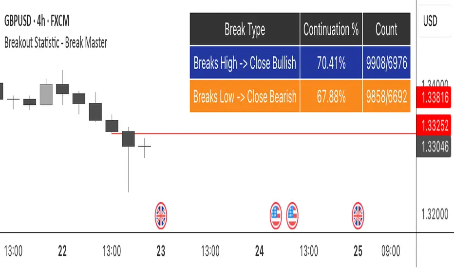 BreakMaster 📈🔥 empowers you to track market momentum by analyzing breakout patterns! 🚀 This indicator detects when the price breaks above the previous candle’s high or below its low and calculates how often these breakouts result in bullish or bearish closes. 📊 Results are displayed in a sleek, easy-to-read table, helping you make informed trading decisions! 💡
